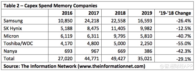 主要原因是内存公司的资本支出下降,这与库存过剩以及3D NAND和DRAM芯片供应过量有关。总而言之,2019年资本支出预计将下降29.1%。