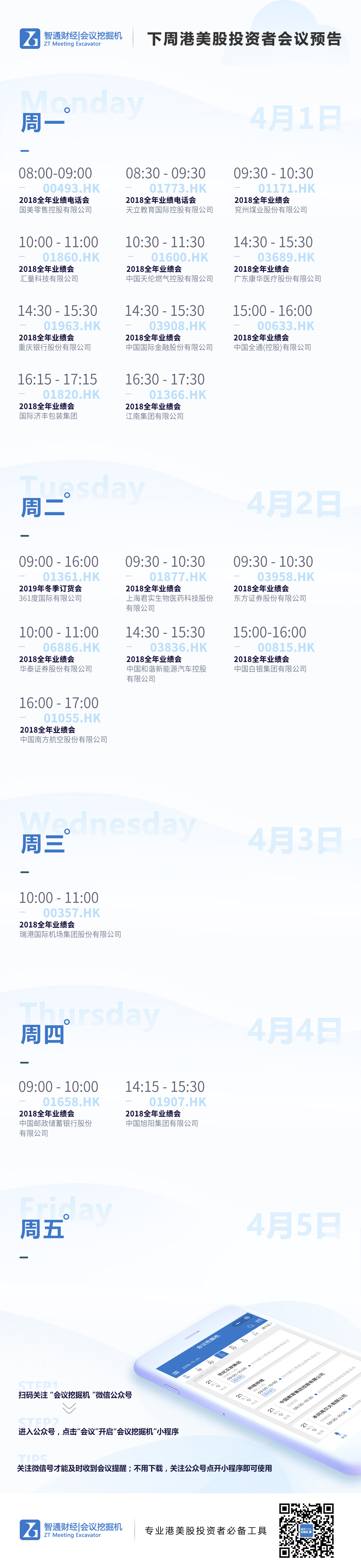 以下是智通财经“会议挖掘机”为您整理的下周(4月1日-4月5日)港美股上市公司会议日历。