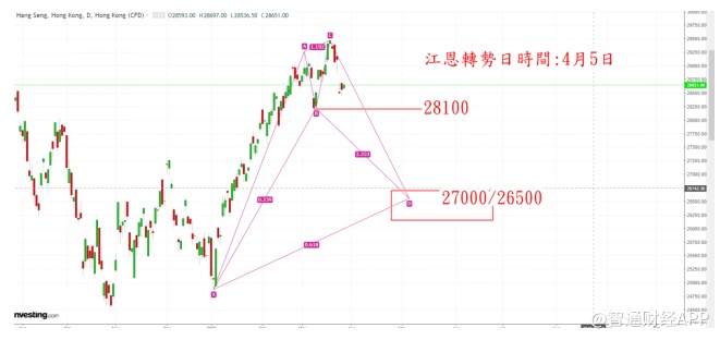 至于恒生指数方面,同样是双头走势,如任何时间点跌穿28100点水平,恒生指数就有机会跌至27000/26500水平。目前读者必须留意两个时间点,包括清明节及复活节(4月19-22日),这些时间点股市通常会比较波动,虽说现在股市双顶走势非常明显,但有一点要提醒的是,我们的预测也有可能会出现纰漏,要提防他们逼空头平仓之后再下跌,一直到我们经常强调的6月份时间点。