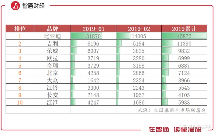 从品牌上看,比亚迪新能源汽车保持第一的位置不可动摇,2019年1月及2月,销量分别是排第二名(吉利)的5.14倍和2.7倍。以下为国内新能源销量排名前十的品牌: