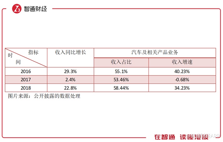 从过去三年业绩看,该公司收入复合增长率为12.1%,其中2017年收入增速较低(单位数增长),2018年业绩恢复高增长水平。实际上,该公司过去三年出现的增长波动主要受核心业务汽车及相关产品业务的影响,包括2017年出现的低速增长,该公司核心业务收入比重有增加的趋势。