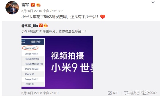其实,小米一直注重内功修炼,据智通财经APP了解,2018年小米手机硬件研发团队人员增加了2倍多,同时成立了相机部、预研部,手机拍照取得了巨大进步,小米9的视频DxO评测99分,稳居全球第一,同时还攻克了5G手机、折叠屏手机的关键技术。