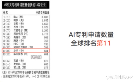 而从技术专利储备情况来看,截至2018年年末,小米集团已于国家知识产权局获得5000多项授权专利(包括自主申请和购买),有超过1.09万项专利申请在受理中。放眼全球,小米集团已在多个海外国家及司法权区获得4600多项授权专利,并有超过4400项专利申请正在受理中。其中,小米在AI领域专利积累成果斐然,日经中文网统计,2018年小米在AI领域申请的专利达到了684件,申请数量也从全球的第85名飙升到了第11名,在榜单上超过了华为。