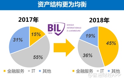 此外,卢森堡国际银行的并表让联想控股的资产结构更为均衡。2017年时,联想控股总资产中,IT业务的占比还高达55%,但至2018年,IT板块的资产占比下降至36%,金融服务的占比则由15%上升至45%。资产构成单一结构的打破,新的支柱型资产的成型,也使得联想控股抗风险能力显著增强。