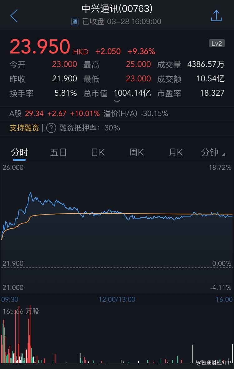 截至今日收盘,中兴通讯(00763)涨9.36%,报23.95港元。