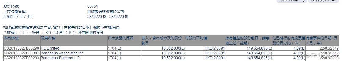 智通财经APP获悉,根据联交所资料显示,富达于3月22日减持创维数码(00751)1058万股,每股作价2.81港元,总值2972.98万港元,最新持股数目约1.49亿股,最新持股比例减至4.89%。