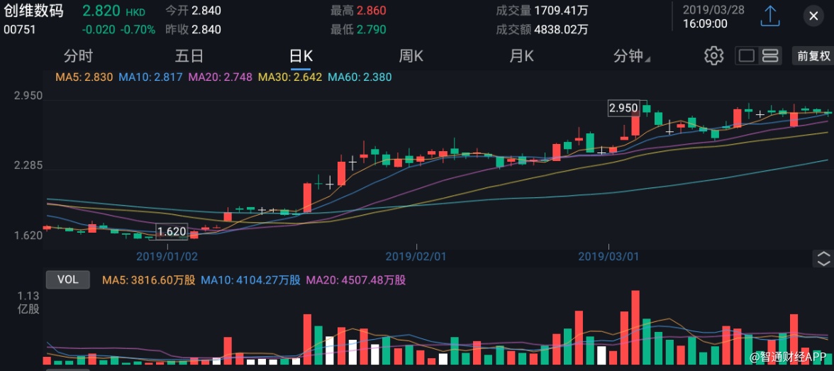 截至今日收盘,创维数码(00751)跌0.70%,报2.82港元。