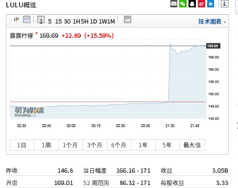 智通财经APP获悉,智通财经APP获悉,周四美股开盘,露露柠檬(LULU.US)股价向上,截至发稿,涨15.59%,报169.69美元。