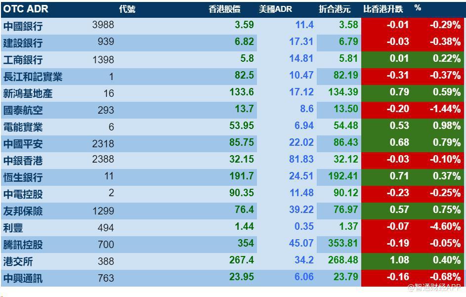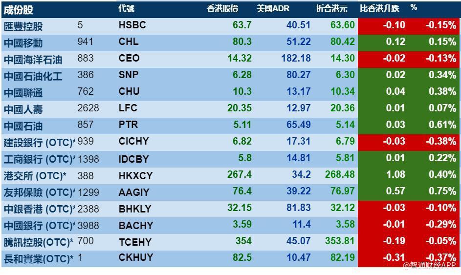 智通财经APP获悉,周四美股小幅上扬,隔夜港股ADR也跟随其走势,按比例收报286798点,升22.80点或0.08%。其中,汇丰控股收报63.60元,较港收市跌0.15%;腾讯控股收报353.81港元,较港股收跌0.05%。