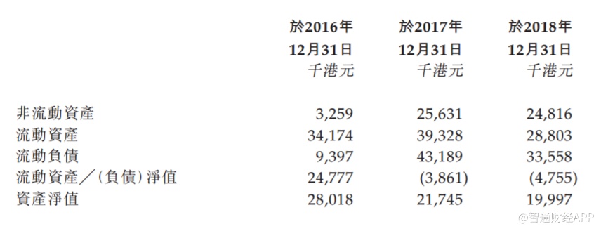 该公司录得流动负债由2016年12月31日止至2017年12月31日大幅增加约33.4百万港元,于2017年12月31日的流动负债净额为3.9百万港元。于2018年12月31日,流动负债净额增加至约4.8百万港元。