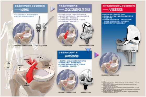 如何提高患者满意度,加快患者术后康复速度,使他们早日回归正常生活,是人工关节领域研究者们面临的一个重要课题,几十年来,各国研究者们针对手术中前后交叉韧带的功能替代进行了持续探索。交叉韧带是膝关节重要构成部分,包括前交叉韧带和后交叉韧带,我们经常会在体育新闻中看到运动员尤其是足球选手因交叉韧带损伤而需要手术或休息的消息,可见它们对于保持膝关节的稳定性和运动功能的重大作用。最早一代的膝关节假体“铰链膝”要同时切除前交叉韧带和后交叉韧带,仅能为患者术后提供伸屈活动及机械性的稳定,很难恢复正常的旋转运动功能。