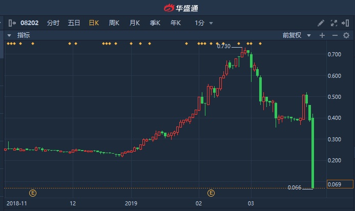 智通财经APP获悉, 汇创控股(08202)午后遭遇洗仓式暴跌,创历史新低0.066港元,截至15时43分,跌79.74%,报0.079港元,成交额达1.574亿港元。