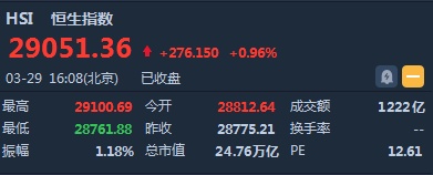 智通财经APP获悉,恒指早盘高开0.13%,报28812.64点。截至收盘,恒生指数涨276.15点或0.96%,报29051.36点,全日成交额达1222.45亿。国企指数涨0.75%,报11379.62点,红筹指数涨2.35%,报4679.15点。