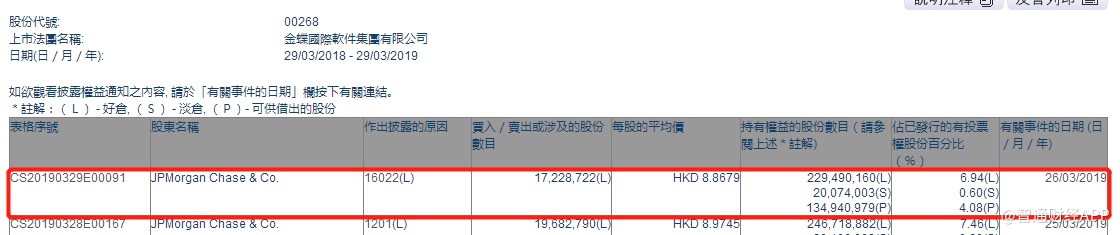 智通财经APP获悉,根据联交所资料显示,摩根大通于3月26日减持金蝶国际(00268)1722万股,每股作价8.87港元,总值约1.53亿港元,最新持股数目约2.29亿股,最新持股比例减至6.94%。