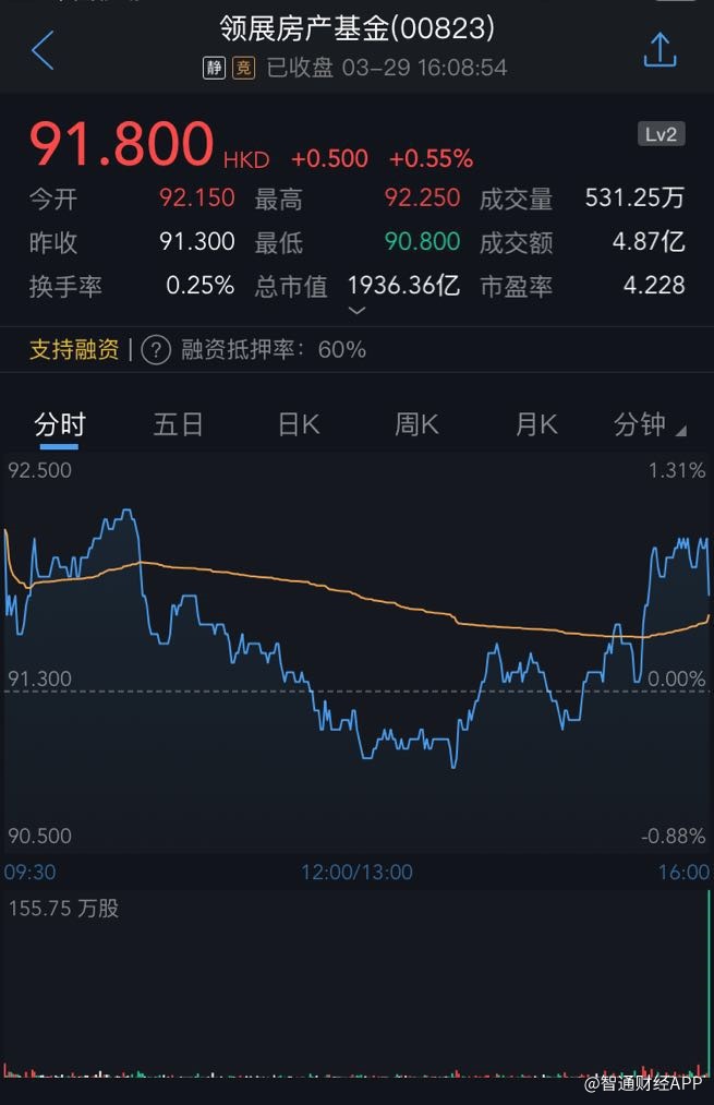 截至今日收盘,领展房产基金(00823)涨0.55%,报91.80港元。