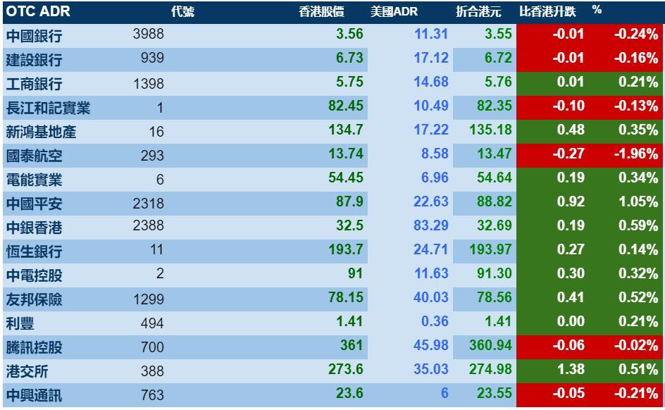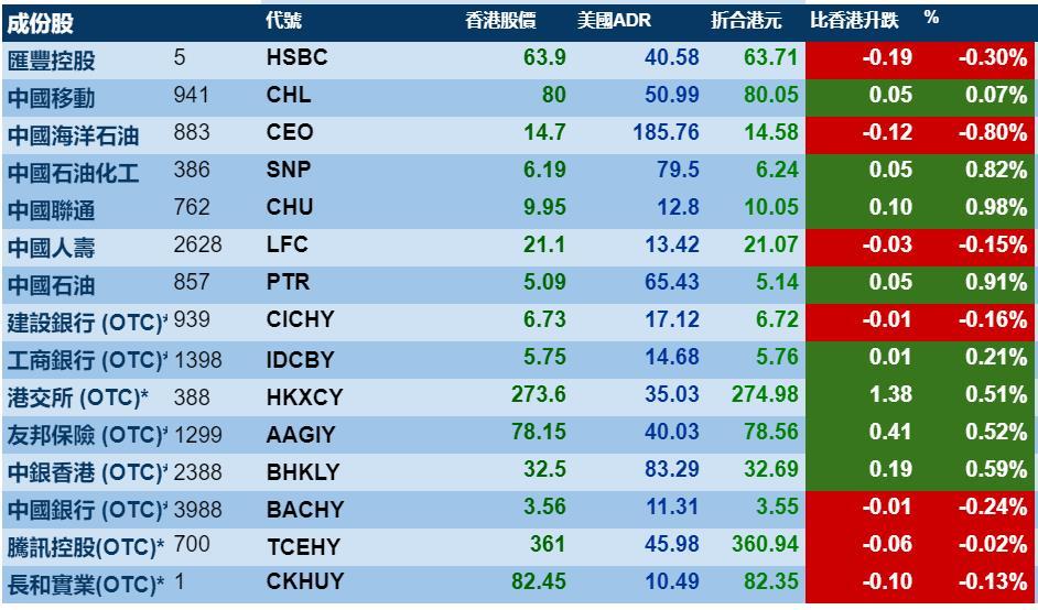 智通财经APP获悉,周五美股继续延续上涨势头,隔夜港股ADR也跟随其走势,按比例收报29676点,升19.79点或0.07%。其中,汇丰控股收报63.71元,较港收市跌0.30%;腾讯控股收报360.94港元,较港股收跌0.02%。