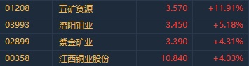 智通财经APP获悉,铜板块个股早盘集体上扬,截至发稿,五矿资源(01208)涨11.91%,洛阳钼业(03993)涨5.18%,紫金矿业(02899)涨4.31%,江西铜业(00358)涨4.03%。