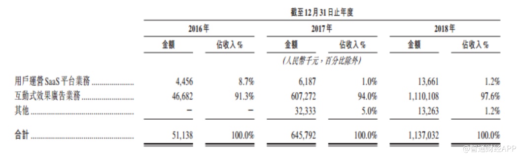 于往绩记录期间,按所得收入计,该公司的互动式效果广告业务取得了快速增长。于2016年、2017年及2018年,其互动式效果广告业务产生的收入占其总收入的百分比分别为91.3%、94%及97.6%。据艾瑞咨询数据,按2018年收入计,该集团占中国整体移动广告市场的0.3%。