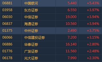 智通财经APP获悉,A股券商板块午后快速拉升,H股中资券商股跟涨。截至14时06分,中国银河(06881)涨5.43%,报价5.44元,东方证券(03958)、中信证券(06030)海通证券(06837)及中信建投(06066)升逾3%,广发证券(01776)及光大证券(06178)涨超2%。