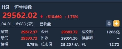截至收盘,恒生指数涨510.66点或1.76%,报29562.02点,全日成交额达1286.04亿。国企指数涨1.56%,报11557.63点,红筹指数涨0.95%,报4723.6点。