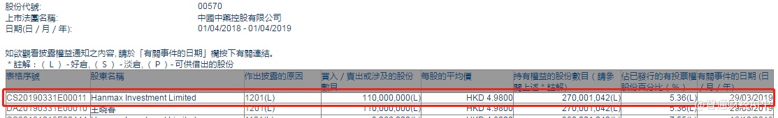 智通财经APP获悉,根据联交所资料显示,Hanmax Investment Ltd于3月29日减持中国中药(00570)1.1亿股,每股作价4.98港元,总值约5.48亿港元,最新持股数目约2.70亿股,最新持股比例减至5.36%。