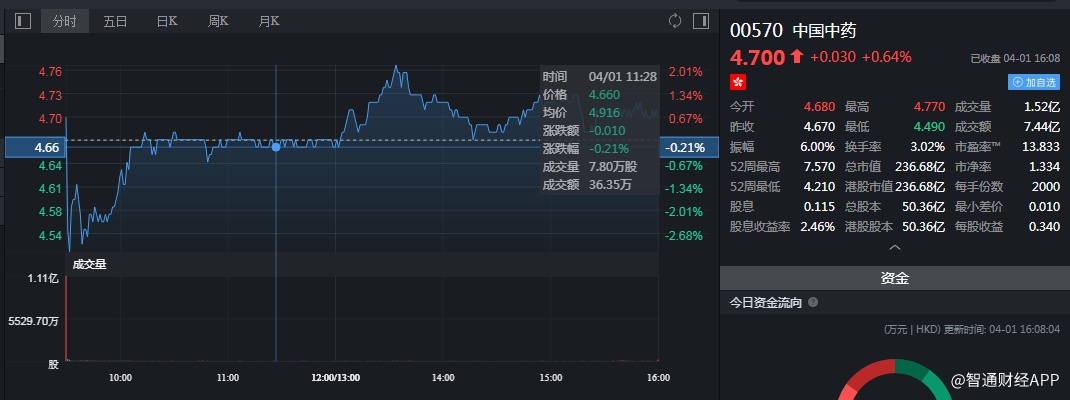 截至今日收盘,中国中药(00570)涨0.64%,报4.70港元。