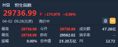 智通财经APP获悉,恒生指数开盘涨174.97点或0.59%,报29736.99点。国企指数涨0.64%,报11631.15点。红筹指数涨0.61%,报4752.45点。大市盘前成交47.26亿港元。隔夜美股三大指数集体收涨,标普500创近半年新高。关于第九轮中美经贸高级别磋商,刘鹤副总理已启程前往美国。
