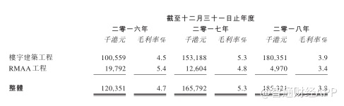 截至2018年12月31日止三个年度各年,楼宇建筑工程的毛利率分别约为4.5%、5.3%及3.9%。截至2016年12月31日止年度楼宇建筑工程的毛利率低于截至2017年12月31日止年度,是由于截至2016年12月31日止年度一个项目(于往绩记录期前完工)的成本超支而录得亏损约9.9百万港元。