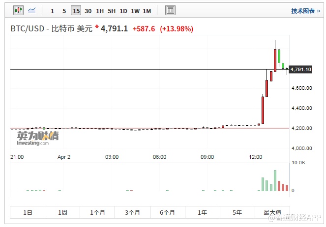 智通财经APP获悉,比特币兑美元日内暴涨,截至发稿时间,涨幅已高达13.98%,报4791.1美元/1比特币。