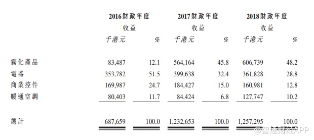 于往绩记录期间,公司与逾60名客户保持业务关系,产品运往逾25个国家和地区。2016—2018财年,公司分别录得收益约6.88亿港元、12.33亿港元及12.57亿港元。其中,雾化产品逐渐成为公司的主要收入来源,2018年的收益占比为48.2%,依次还有电器、商业控件及暖通空调,收益占比分别为28.8%、12.8%及10.2%。根据欧睿报告,公司是中国15大消费EMS供应商中唯一未上市的公司。