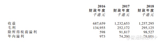 招股书显示,公司2016—2018财年收益分别为6.88亿港元、12.33亿港元及12.57亿港元;毛利分别为1.35亿港元、2.52亿港元及2.95亿港元;年内溢利分别为97.3万港元、7420万港元及7880.1万港元。