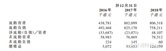 公司于往绩记录期间的净流动资产/负债状况有所改善。于2017年12月31日,公司记录净流动负债2310万港元,而2016年12月31日的净流动负债5370万港元,主要由于贸易应收款项增加1.43亿港元以及应收同系附属公司及当时的直接控股公司款项合计增加1.14亿港元。2018年12月31日,公司录得净流动资产4810万港元。