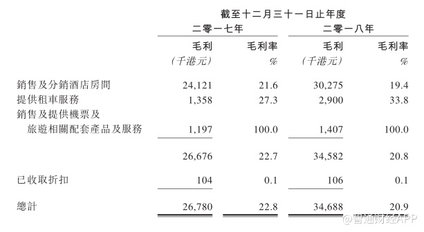 该集团整体的毛利率由截至2017年12月31日止年度约22.7%减少至截至2018年12月31日止年度约20.8%。有关减少乃主要由于销售及分销酒店房间的毛利率由截至2017年12月31日止年度减少至截至2018年12月31日止年度,被提供租车服务的毛利率增加所抵销。