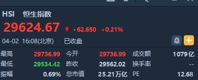 智通财经APP获悉,恒指早盘高开0.59%,逐步回落后维持横盘整理态势。截至收盘,恒生指数涨62.65点或0.21%,报29624.67点,全日成交额达1079.56亿。国企指数跌0.09%,报11546.66点,红筹指数跌0.32%,报4708.42点。