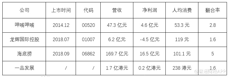 智通财经APP获悉,龙辉国际于2004年在上海起家,2010年开始拓展市场,先后进入北京、深圳、南京和杭州,主要经营粤式火锅,旗下拥有“辉哥”、“小辉哥”以及 “洪员外”等品牌。截至2018年12月31日,龙辉国际拥有及经营合计99家店。2018年营收6.2亿元,同比下降10.1%,净利润亏损4.5亿元。看来上市后的“辉哥”日子过得并不好。