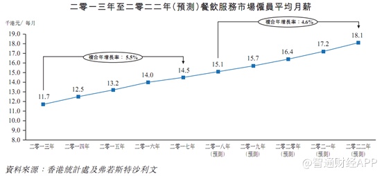 智通财经APP获悉,最近三年,员工成本大幅上升。据弗若特沙利文报告,香港餐饮服务行业雇员的平均月薪由2013年的11,700港元升至2017年的14,500港元,复合年增长率为5.5%。平均月薪增长乃基于通货膨胀、生活成本上涨加上劳动力短缺所致。再者,预期年轻员工对进入香港餐饮业的兴趣不大,将继续推动平均月薪增加,预计至2022年底将达到18,100港元。