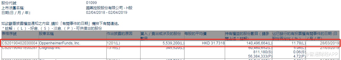 智通财经APP获悉,根据联交所资料显示,OppenheimerFunds, Inc.于3月28日减持国药控股(01099)554万股,每股作价31.7318港元,总值约1.76亿港元,最新持股数目约1.40亿股,最新持股比例减至11.78%。