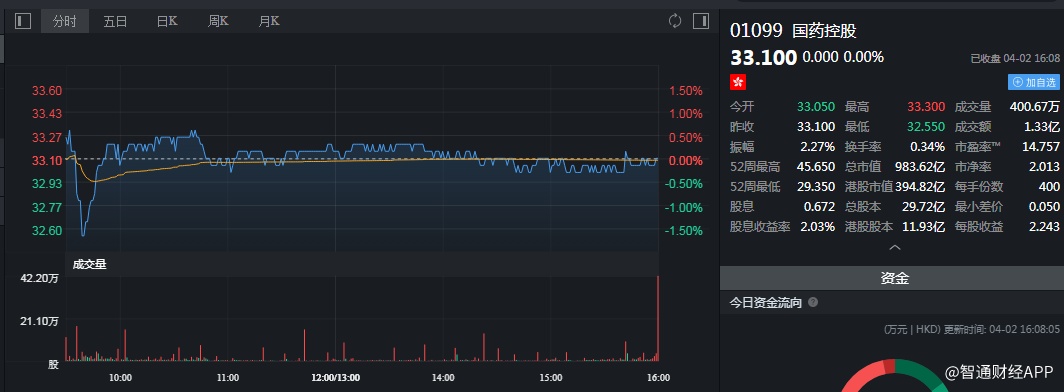 截至今日收盘,国药控股(01099)无涨跌,报33.10港元。