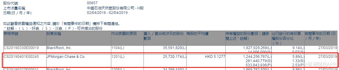 智通财经APP获悉,根据联交所资料显示,摩根大通于3月27日减持中国石油(00857)2572万股,每股作价5.1277港元,总值约1.32亿港元,最新持股数目约12.44亿股,最新持股比例减至5.89%。