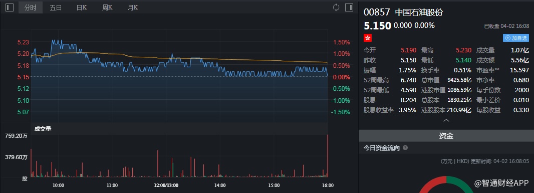 截至今日收盘,中国石油(00857)无涨跌,报5.15港元。