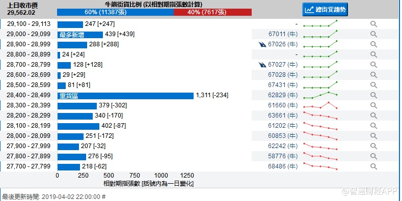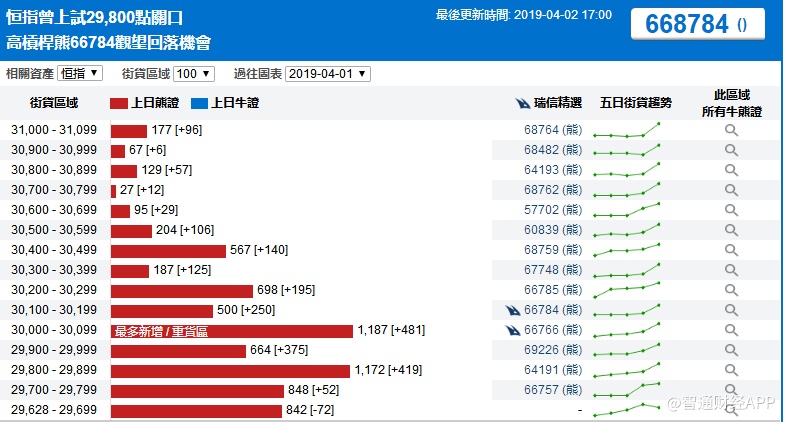 智通财经APP获悉,截至4月2日,恒指最新的牛熊街货比例60:40。从瑞信恒指牛熊证街货分布图中得到的数据显示,熊证街货重货区在30000-30099区间,该区间最新熊证数量为1187张,较上一交易日增加481张;最多新增区间也在该区间。牛证街货重货区在28400-28499区间,该区间最新牛证数量为1311张,比上一交易日减少234张;最多新增区间在29000-29099。