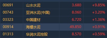 智通财经APP获悉,水泥板块早盘表现活跃,截至发稿,山水水泥(00691)涨9.85%,亚洲水泥(00743)涨3.2%,中国建材(03323)涨1.36%,海螺水泥(00914)涨0.91%。