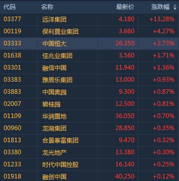 智通财经APP获悉,麦格理指内房发展商3月合同销售表现复苏,首选世房(00813)、龙湖(00960)及中国金茂(00817)。内房股今日整体走高,远洋集团(03377)领涨内房,截至13时38分,远洋集团涨13.28%,保利置业(00119)涨4.27%,中国恒大(03333)涨2.73%,佳兆业(01638)、融信中国(03301)升逾1%。