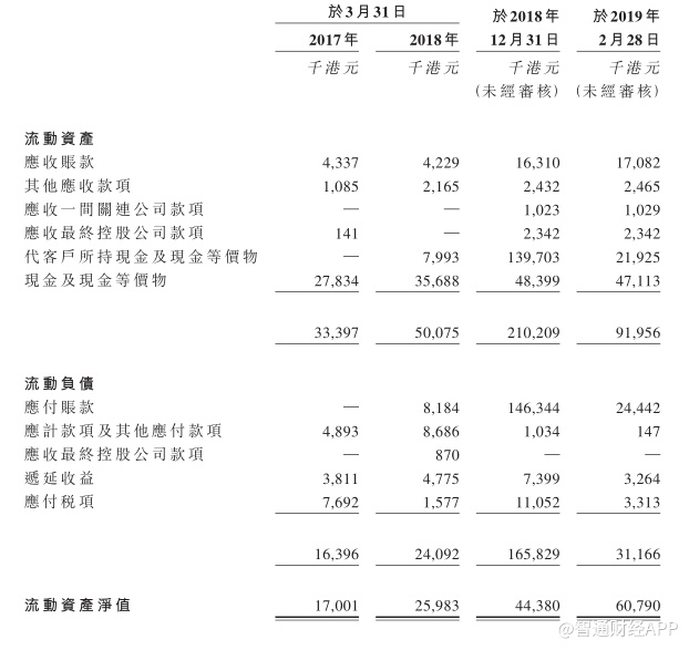 于2019年2月28日,流动资产净值约为60.8百万港元,相当于自2018年12月31日约44.4百万港元增加约16.4百万港元。该流动资 产净值增加乃主要由于(i)应付账款减少约121.9百万港元;(ii)应付税项减少约7.7百万港元;及(iii)递延收益减少约4.1百万港元;由代 客户所持现金及现金等价物减 少约117.8百 万港元部分抵销。于2019年2月28日,应收一间关联公司款项及应收最终控股公司款项已于本文件日期悉数结算。