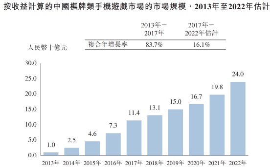 4、招股书预计棋牌类手游未来几年的复合年增长率为16.1%,也不知道可信度有多大,招股书还显示:棋牌类手游腾讯的占比为26.8%,留给其他玩家的市场空间还比较大。这种类型的游戏不是很赚钱,大概腾讯不太上心。6.5分