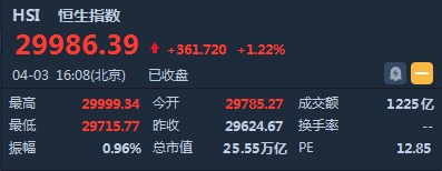 智通财经APP获悉,恒指早盘高开160.6点或0.54%,报29785.27点。截至收盘,恒生指数涨361.72点或1.22%,报29986.39点,全日成交额达1225.95亿。国企指数涨1.37%,报11705.16点,红筹指数涨0.72%,报4742.23点。