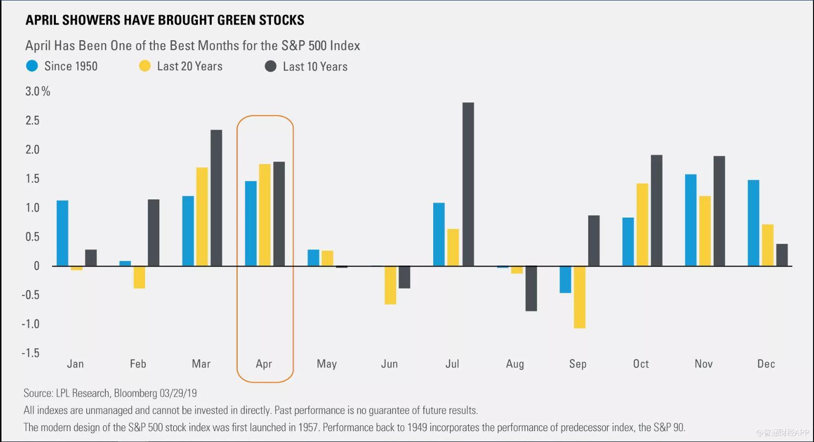 自1999年,标普500指数在4月份平均上涨1.7%。LPL Financial的高级市场策略师Ryan Detrick在本周一发布的研究报告中写道:“四月效应在牛市当中尤为明显,基金经理们可能会在新的一个季度开始调整投资组合,春天和好天气的到来会减轻每个人的负面情绪。”