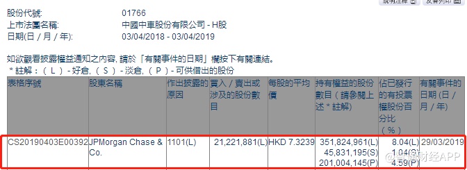 智通财经APP获悉,根据联交所资料显示,摩根大通于3月29日增持中国中车(01766)2122万股,每股作价7.3239港元,总值约1.55亿港元,最新持股数目约3.51亿股,最新持股比例增至8.04%。
