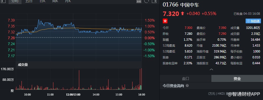 截至今日收盘,中国中车(01766)涨0.55%,报7.32港元。