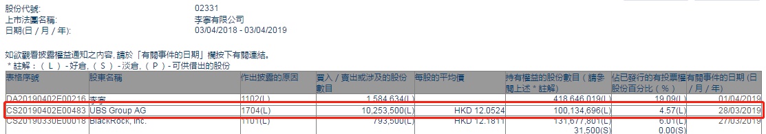 智通财经APP获悉,根据联交所资料显示,瑞银集团于3月28日减持李宁(02331)1025万股,每股作价12.05港元,总值约1.24亿港元,最新持股数目约1.0亿股,最新持股比例减至4.57%。
